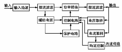 交流或直流的輸入電壓經“輸入陷波”電路后到“整流濾波”電路,得到高壓(約300V)直流電壓�!肮β兽D換”將高壓直流逆變成約35kHz的高頻交流,經高頻變壓器變換到輸出所需的電壓,再經高頻整流濾波得到輸出電壓。控制電路對輸出電壓和輸出電流取樣,閉環(huán)反饋后產生脈寬調制(PWM)信號控制“功率轉換”電路,使輸出電壓或電流保持穩(wěn)定。
