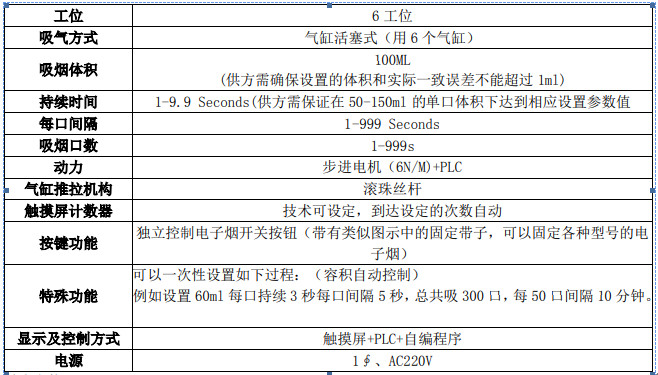 本機用于測試電子煙和煙油,采用氣缸活塞式吸氣,通過設(shè)置相應(yīng)的吸煙持續(xù)時間,吸煙體積和吸煙次數(shù), 來判定電子煙是否合格,適用于小功率電子煙。