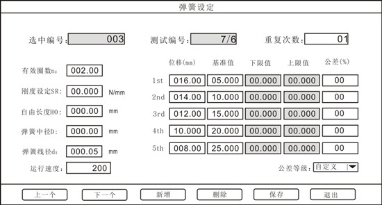 a、測(cè)試編號(hào):測(cè)試編號(hào)最大可設(shè)置到32,按“新增”后,測(cè)試編號(hào)增加一組,輸入需要測(cè)試的彈簧參數(shù),按“保存”即可。如下圖所示: