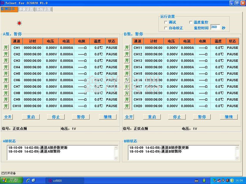 兩組電壓可任意設(shè)置20路同時監(jiān)測,自動記錄并顯示電壓/電流/DCR/溫升/試驗時間和狀態(tài)