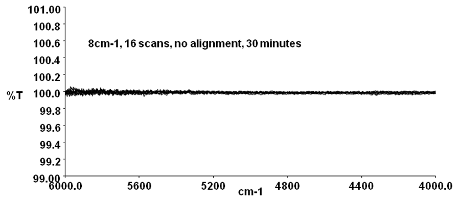 PerkinElmer 采用了專利的動鏡機械轉(zhuǎn)動式干涉儀設(shè)計,轉(zhuǎn)動基體上固定兩面平面鏡。動鏡機械轉(zhuǎn)動式干涉儀能從根本上消除傳統(tǒng)干涉儀無法避免的動鏡傾斜和切變的影響,無須再對干涉儀中的反射鏡面進行動態(tài)調(diào)整!另外,無動態(tài)錯誤的干涉儀采用的平行于地面的設(shè)計,無地心引力的影響,故不存在三維空間垂直分布問題。下圖為PE公司機械轉(zhuǎn)動式干涉儀沒有經(jīng)過校正得到的基線圖,穩(wěn)定性非常好。