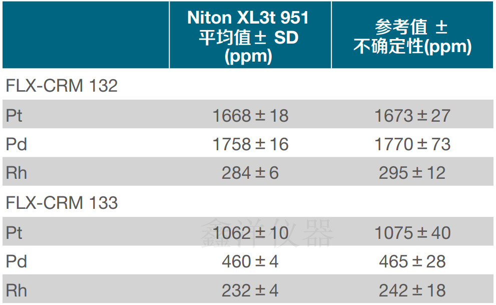 XL3t 951 GOLDD+在能力驗(yàn)證中給出的檢測(cè)數(shù)據(jù),證明其對(duì)Pt, Pd, Rh的分析數(shù)據(jù)具有好的準(zhǔn)確性。