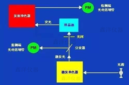 由高壓汞燈或氙燈發(fā)出的紫外光和藍(lán)紫光經(jīng)濾光片照射到樣品池中,激發(fā)樣品中的熒光物質(zhì)發(fā)出熒光,熒光經(jīng)過濾過和反射后,被光電倍增管所接受,然后以圖或數(shù)字的形式顯示出來。