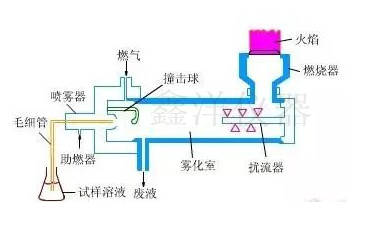 把待測液用霧化器使之變成溶膠導(dǎo)入火焰中,待測元素因熱離解生成 基態(tài)原子,在火焰中被激發(fā)而產(chǎn)生光譜,經(jīng) 單色器分解成 單色光后通過光電系統(tǒng)測量,由于火焰的濕度比較低,因此只能激發(fā)少數(shù)的元素,而且所得的光譜比較簡單,干擾較小