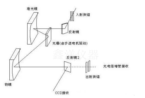 組成:入射狹縫、 準(zhǔn)直元件: 使狹縫發(fā)出的光線變?yōu)槠叫泄�、色散元�? 通常采用光柵、聚焦元件: 聚焦色散后的光束探測器陣列